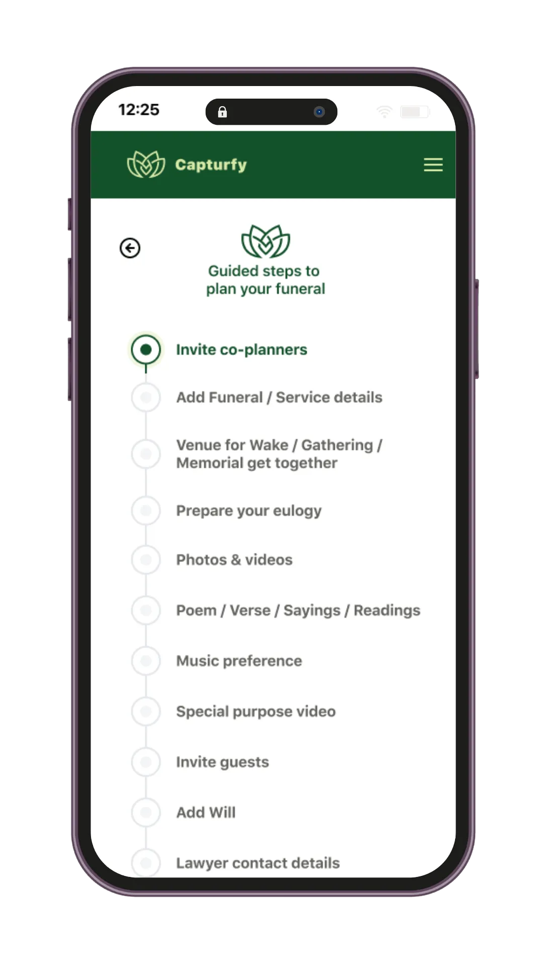 Capturfy simplifies funeral arrangements, allowing you to focus on celebrating the life of your loved one and creating a lasting tribute.