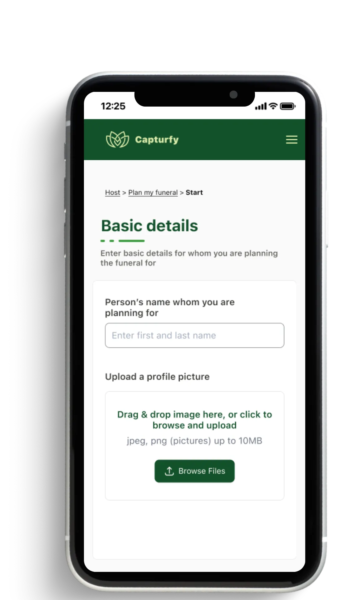 Capturfy simplifies funeral arrangements, allowing you to focus on celebrating the life of your loved one and creating a lasting tribute.